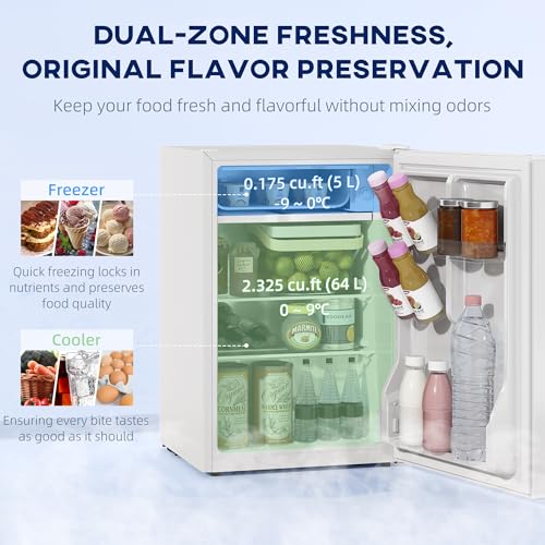 Smart Storage with Spacious Capacity: With 2.5 Cu.Ft (69 L) of interior space, removable shelves, and a door storage design for cans, this bar fridge helps you organize your items efficiently and keep everything within easy reach.