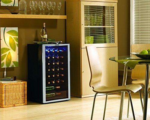 There’s no better way to show off your wine collection than with this impressive free-standing wine cooler from Danby. This elegant unit is very economical and the most convenient way to store and chill your favorite types of wine. The cooler comes with a generous 3.2 Cubic foot-capacity which can easily handle up to 35 wine bottles. The bright led interior-light display is perfect for showmanship and making sure you can easily find the bottle you’re looking for. Your wines will always be at the proper temperature as this clever appliance allows you to set the temperature from anywhere between 6-degree c and 14-degree c (42.8-degree F and 57.2-degree F). Your collection is well protected due to the attractive shatter-resistant tempered-glass door which is trimmed in platinum. The cooler features a convenient automatic-defrosting system and comes with five removable black wire shelves as well as a strong staggered shelf. The reversible door hinge means you can adjust the cooler to open from either the left or right-hand side. This popular wine cooler also offers in-home service on its 12-month parts and labor warranty.