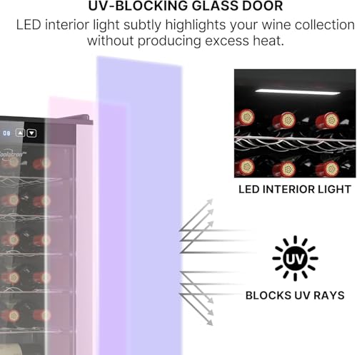 ENERGY-EFFICIENT LIGHTING – The Koolatron 24 Bottle wine cooler is equipped with energy-efficient LED interior lighting. The soft white LED lights gently illuminate your wine bottles, showcasing your collection without generating heat. This long-lasting, energy-efficient lighting helps you maintain a beautiful display of your beverages while being mindful of energy consumption, making it both stylish and sustainable.