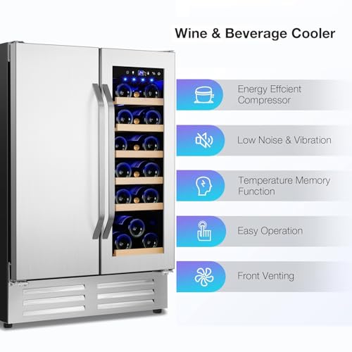 Stainless Steel Doors & Seamless Design:This wine and beverage fridge features stainless steel doors double tempered glass doors and a seamless design to ensure safe operation and seamless air separation; Cools down quickly and better keeps the temperature constant at the set temperature;The door will automatically lock when you close it,soft—close doors feature magnetic seals