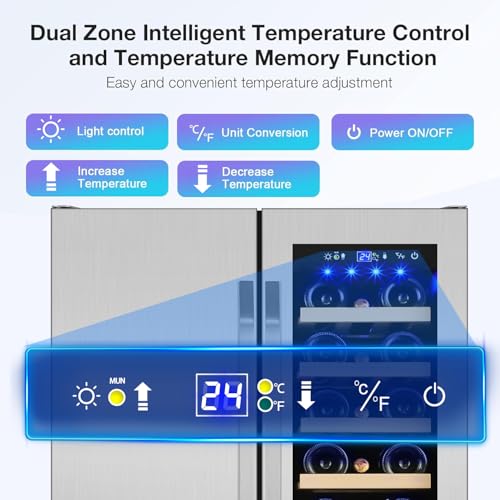 Easy-To-Use Touch Screen & Auto-Defrost:In This dual-zone wine and beer fridge you can easily adjust the temperature and light by touching the digital screen or lock temperature settings with the lock button;The white Led light lets you view the temp and interior condition even in the dark;The fridge is auto-defrosting every 6 hours,No trouble for you to manually set it