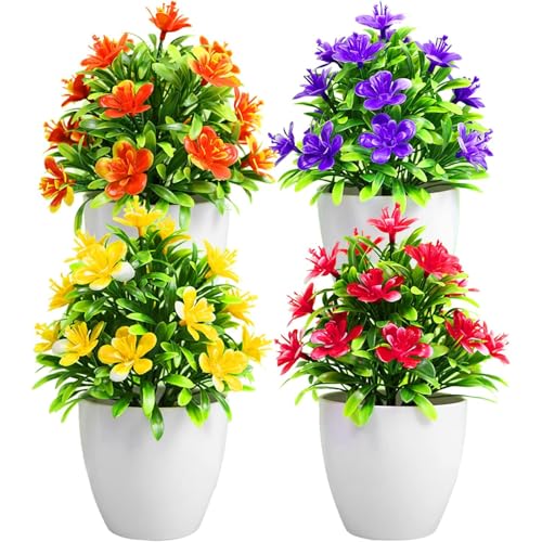 4 Packs Small Fake Plants Mini Artificial Faux Plants with Flowers for Home Room Farmhouse Bathroom Decor Indoor Mini Potted Plants for Office Home Decoration (K189-4)