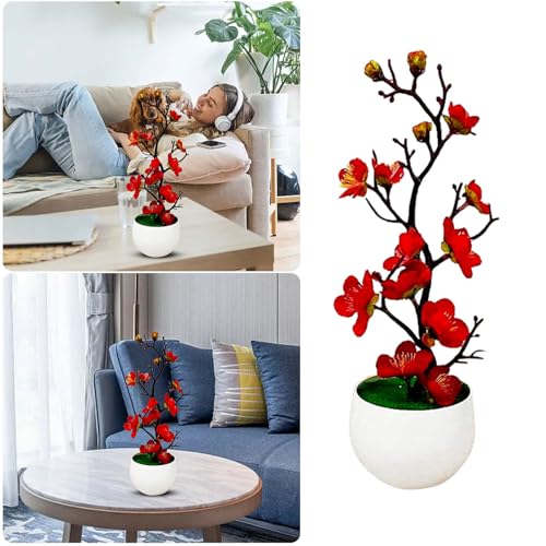 Striking Large Red Flowers: The vibrant red color of the plum blossoms makes this faux flower arrangement a focal point, perfect for creating a bold and eye-catching display.