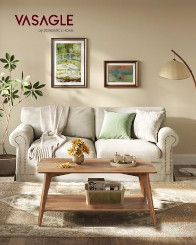 VASAGLE MAEZO Collection – Coffee Table, 2-Tier Center Table with Storage, Tapered Legs, Curved Transitions, 21.7 x 39.5 x 17.7 Inches, Easy to Assemble, for Living Room, Honey Brown ULCT249K01