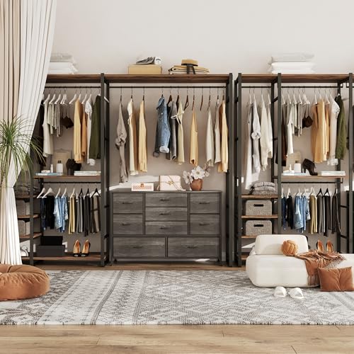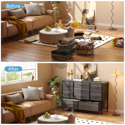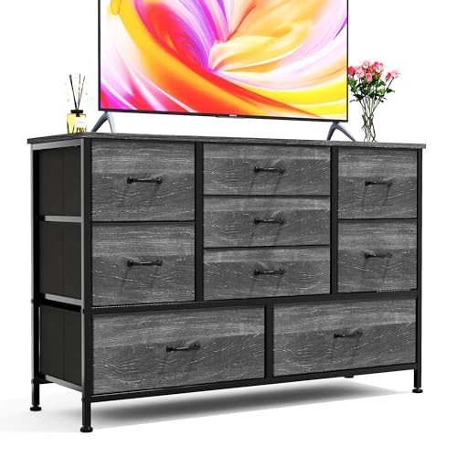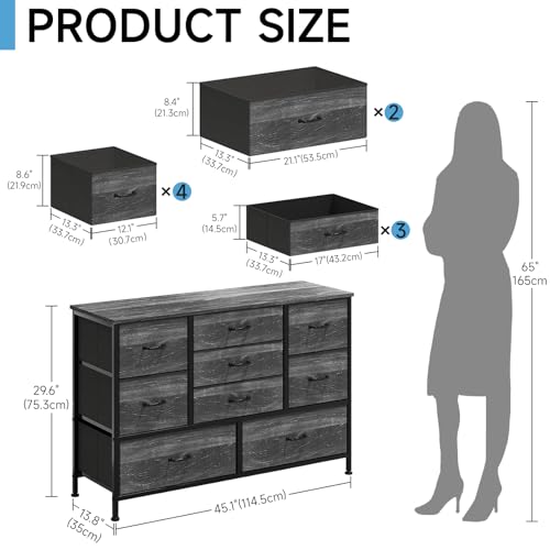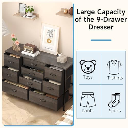 Flrrtenv Tall 9 Drawers Dresser Storage with Wood Top, TV Stand, Fabric Wide Storage Tower, Sturdy Steel Frame Storage Organizer Fit for Bedroom, Living Room, Hallway, Entryway, Closets, Black Oak