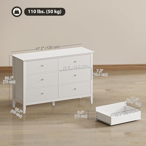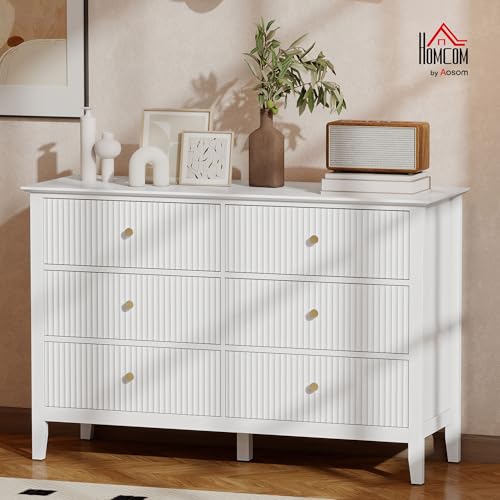 HOMCOM Fluted 6 Drawer Dresser for Bedroom, 47″ Wide Chest of Drawers, Modern Double Dresser for Living Room, Hallway, Closet, White