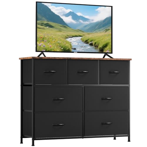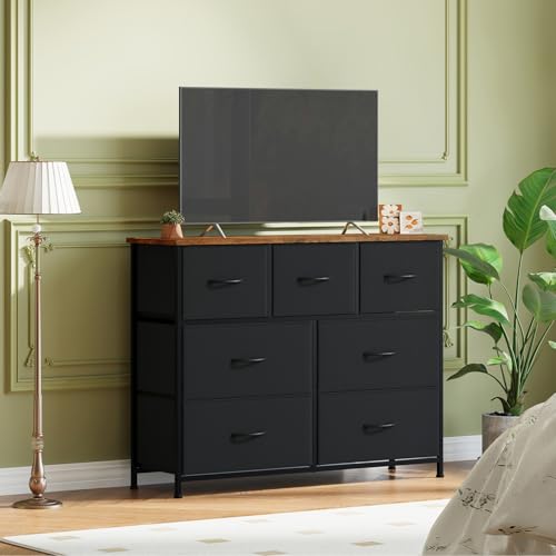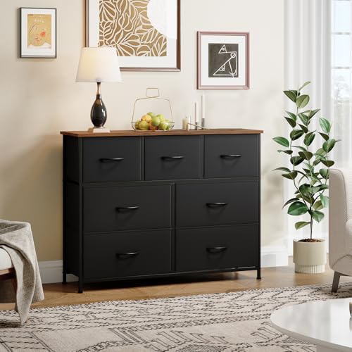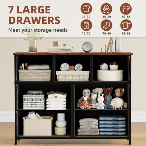 Somdot Dresser for Bedroom with 7 Drawers,Wide Chest of Drawers with Wooden Top,Black Fabric Dresser with Storage Drawers for Living Room,Closet,Entryway,Black Rustic Brown