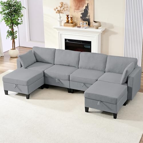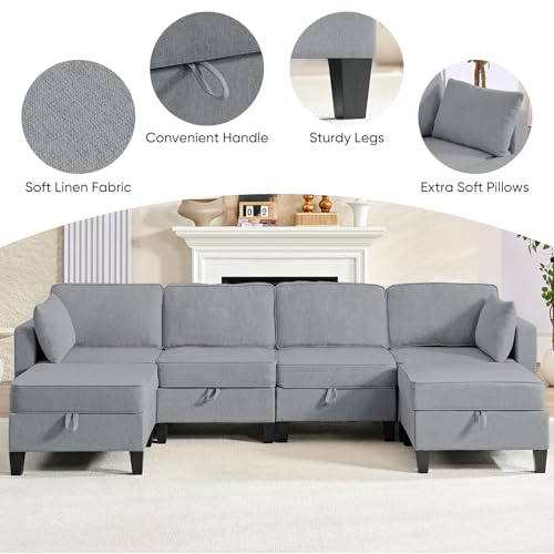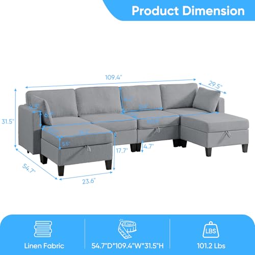 Mjkone 109″W Modular U Shaped Sofa Couch with Storage, Convertible Sectional Couches with Reversible Chaise for Living Room Sets Furniture, 4 Seat Sofa Couch with Ottomans for Home Office, Light Grey