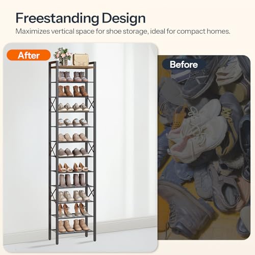 Stable Structure: Equipped with 4 adjustable feet for a steady stand, this vertical shoe rack for entryway is reinforced with 6 x-shaped metal bars on the sides to enhance stability and prevent wobbling. The 10 tier tall shoe rack comes with anti-tip devices to ensure safe use