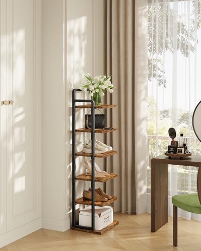 6-Tier Vertical Shoe Rack, Narrow Shoe Tower, Corner Shoe Storage Organizer, Shoe Shelf, for Small Spaces, Industrial Style, for Entryway, Hallway, Living Room, Rustic Brown and Black TXJ06BF