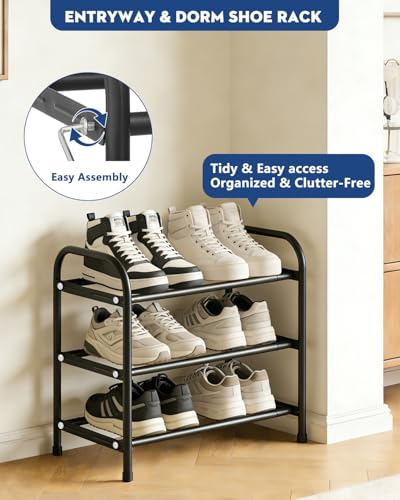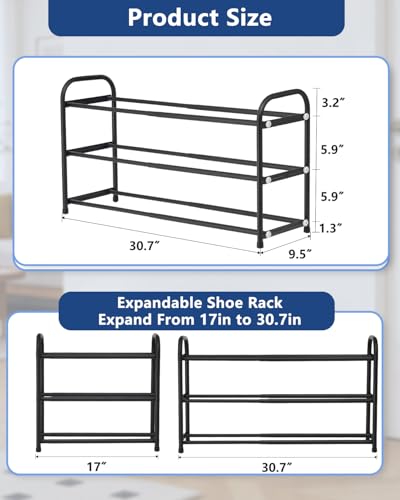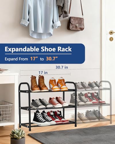 Black Expandable Shoe Rack, 3 Tier Metal Shoe Racks for Closet, Adjustable Sturdy Shoe Organizer Shelf, Heavy Duty Free Standing Shoes Rack, Ideal for Entryway, Garage & Small Narrow Place