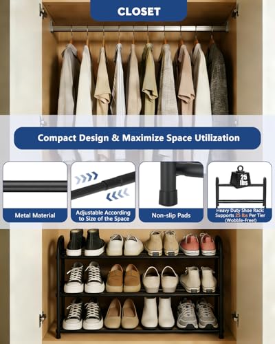 【Works Seamlessly with Every Closet Type】Its expandable design effortlessly extends from 17 inches (43.2 cm) to 30.7 inches (78.1 cm), perfectly fitting all closet styles — walk-in, reach-in, built-in, and utility closets.Holds up to 12 pairs of adult shoes, taming shoe clutter in garages, entryways, bedrooms, tiny apartment nooks, No more ill-fitting racks that waste space or leave shoes scattered