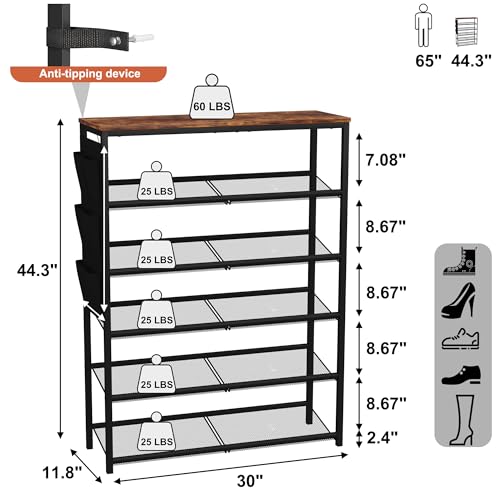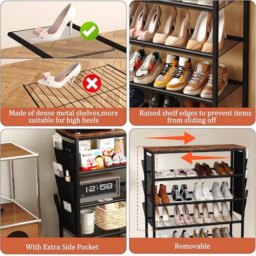 HOMEFORT 6 Tiers Shoe Rack for Entryway,30″ Metal Shoe Shelf, Shoe Closet with Adjustable Mesh Shelves, Shoe Storage Organizer for 18-24 Pairs, Industrial Shoe Stand with Side Pocket, Rustic Brown