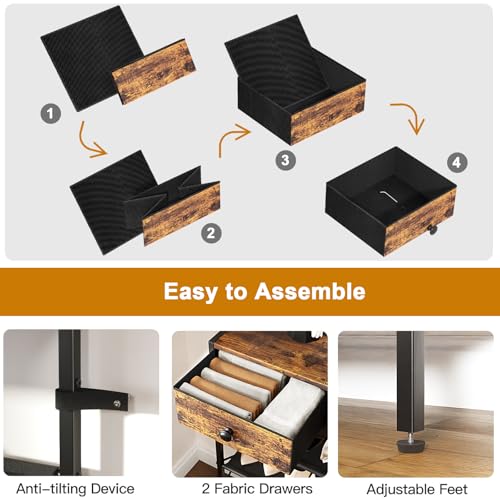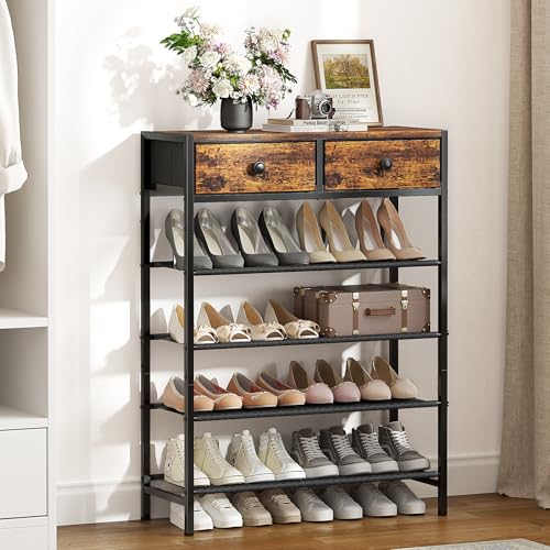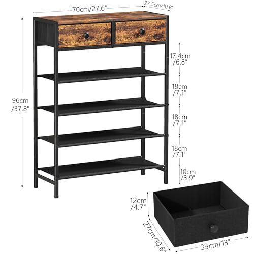 Shoe Rack, 5 Tier Shoe Organizer with 2 Drawers, Metal Shoe Storage for 16-20 Pairs of Shoes with Fabric Shelves and Wooden Top, Narrow Shoe Shelf for Closet Entryway Rustic Brown