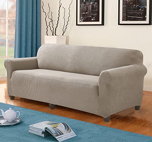 Home Beyond & HB design – Stretch Sofa Covers Slipcovers 3 Seater – Spandex Jacquard Fabric Couch Sofa Cover with Elastic Bottom – Furniture Protectors – (Sofa 72-92 Inches Wide, Stripe Sand)
