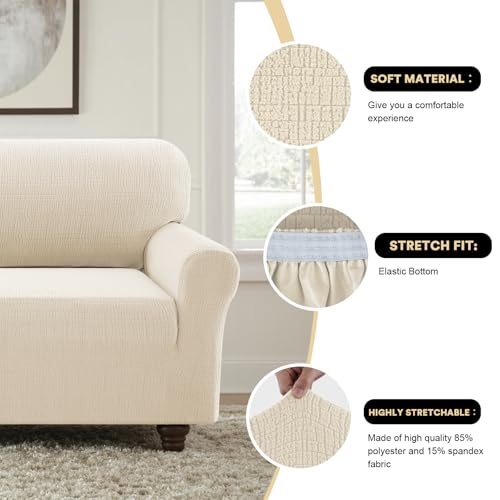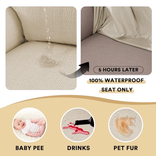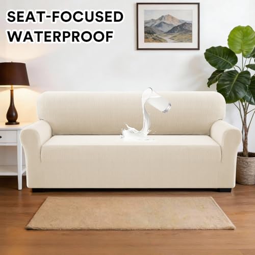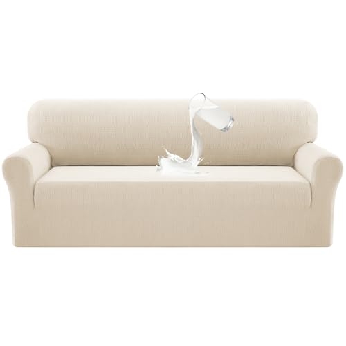 PrinceDeco Waterproof Couch Covers Slipcovers for Large Sofas,1 Piece Stretch Jacquard Sofa Slipcover Leakproof Pet Friendly Furniture Protector for Kids, Dog (Sofa L Seat Width 80″-88″, Ivory)