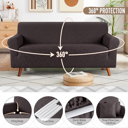 Ruaozz Stretch Sofa Cover 1 Piece Couch Covers for 3 Cushion Couch Non Slip Universal Sofa Slipcover Washable Soft Jacquard Furniture Protector with 2 pcs Throw Pillow Covers (3 Seater, Chocolate)