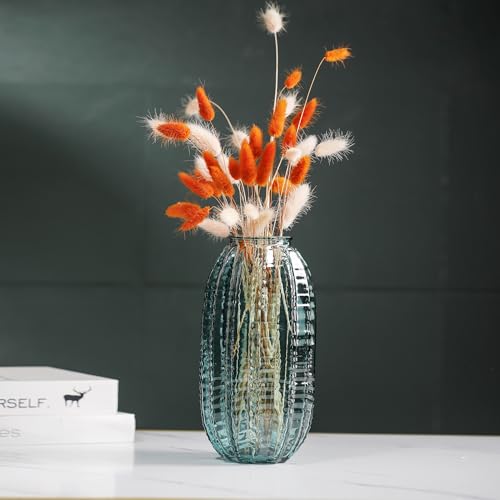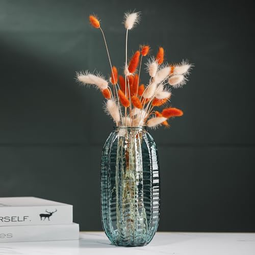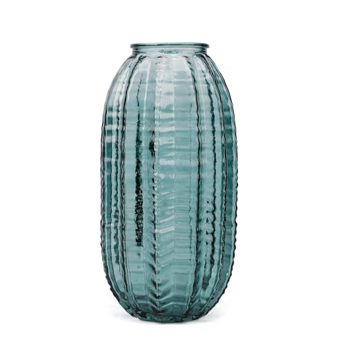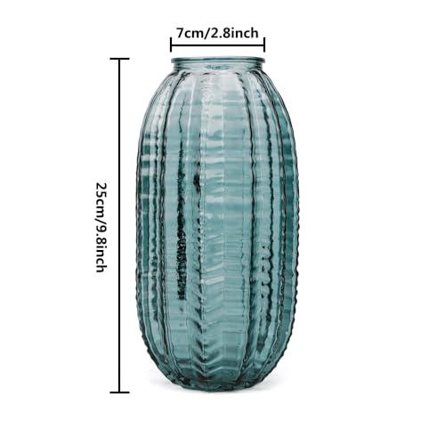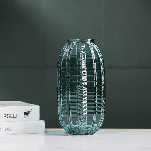 Unique Cylinder Shaped Green Glass Flower Vase-9.8 inch Tall,Simple Striped Design for Home Decor,Centerpieces, Wedding, Dining Table, Arrangement.