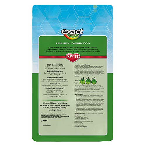 Kaytee exact Rainbow Parakeet and Lovebird food is a premium extruded food and has been the recognized nutritional leader by avian nutritionists, veterinarians and breeders since its introduction over 25 years ago. Each nugget contains “exact nutrition” ensuring your bird gets exactly the right nutrition to produce better feathering, brighter colors and maintain excellent health. exact Rainbow is 100% consumable with no seed hulls or shells for less mess.