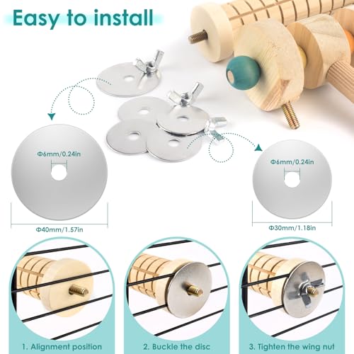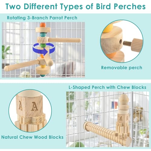 Easy to Install: L-shaped bird perches for cage and the 3-branch wooden perch stand are equipped with metal wing nuts and built-in bolts, allowing them to be firmly fixed inside or outside the cage without the need for additional installation equipment. The top of the wooden hanging chew toy for parakeet is fitted with a metal hook, enabling it to be easily hung from the cage roof, providing more space for parrots to play and stand