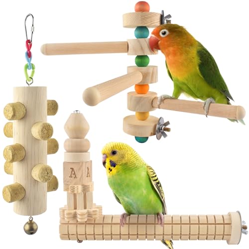 3Pcs Natural Wood Bird Toys, Rotating 3-Branch Parrot Perch Stand, L-Shaped Perches with Chew Block, Hanging Parrots Cage Cork Stopper Chew Puzzle Toy for Small Budgie Cockatiel Lovebird Conure