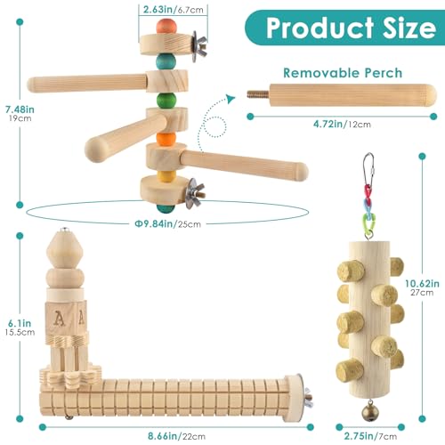 What You Get: DBNESS bird parrot toy set includes: 1 x L-shaped bird perch with chewing wooden block, 1 x rotating 3-branch parrot perches, 1 x bird hanging removable cork chew toy. Provides a variety of parrot toy types to meet your bird’s daily play needs. (Note: Rotating 3 branches of the parrot perch are removable, please check that they are securely mounted before use)