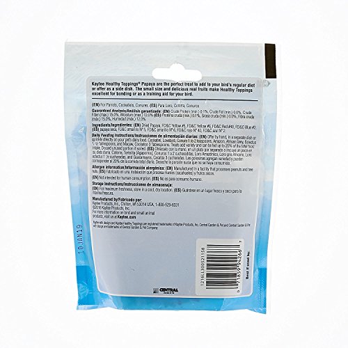 Kaytee Healthy ingredients are the perfect treat to add to your pet bird’s regular diet or offer as a side dish. The small size and delicious real fruit make Healthy Toppings an excellent training aid. Size: 2.5 ounces, Flavor: Papaya Features: – Perfect treat to add to your pet’s regular diet or offer as a side dish. -The small size and delicious real fruit make this an excellent training aid. – Made in the USA. Product type: health products. Animal type: bird. Main color: blue and purple. Main color: gold and yellow. Main color: Reds.