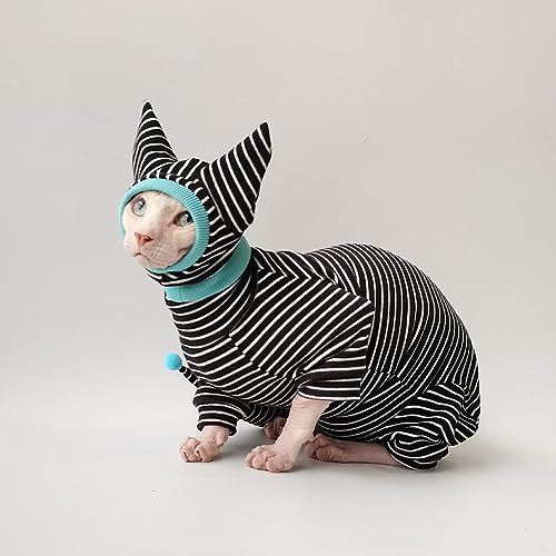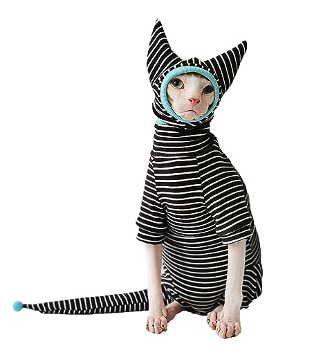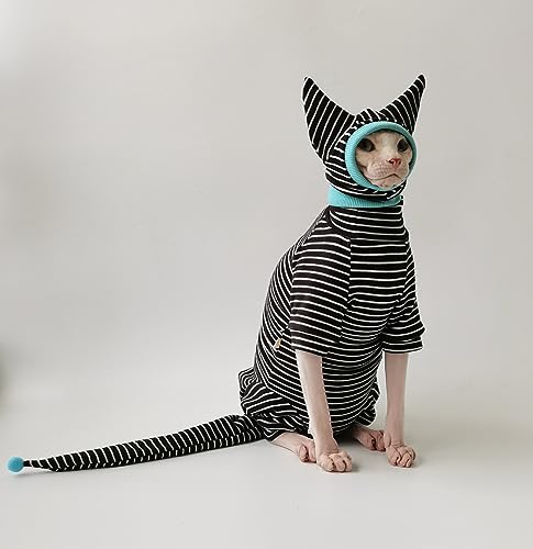 Hairless Cat Clothes, Cat Jumpsuit with Stripes 4 Legged Pajamas, Sphinx Clothing, Cat Apparel for Cats, Pet Onesies, Striped Cat Clothing with Hat and Tail Cover Set (Large, Full Set)