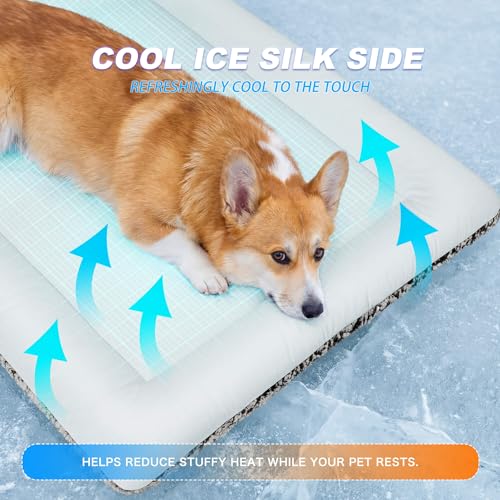 COOLING ICE SILK FOR SUMMER COMFORT: The reverse side features cooling ice silk fabric, providing a refreshing, cool touch. This surface helps maintain your pet’s comfort in warmer temperatures, making it perfect for hot weather or warm environments. It ensures a soothing, cool resting experience during summer.