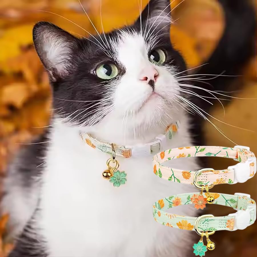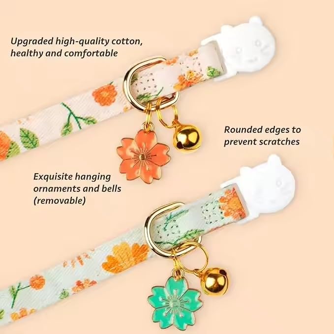 2 Pack Cotton Breakaway Cat Collar Orange and Green Flowers Pendant Cute Kitten Cat Collar with Bell (2pcs Orange&Green)