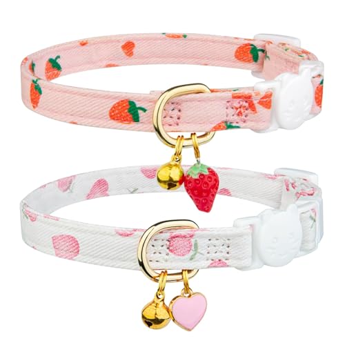 2 Pack Cotton Breakaway Cat Collar Pink Strawberries and White Heart Shaped Pendant Cute Kitten Cat Collar with Bell