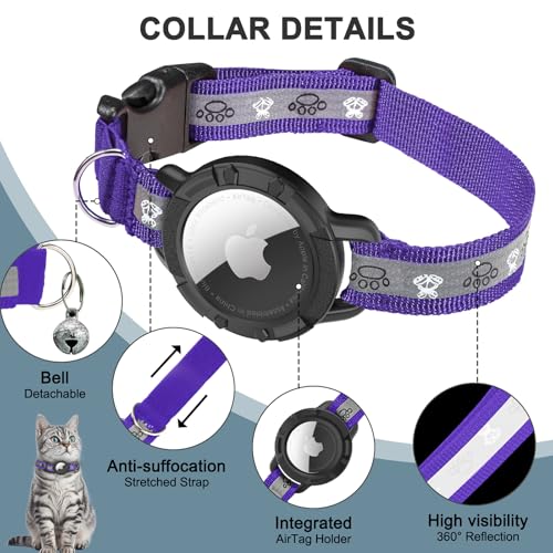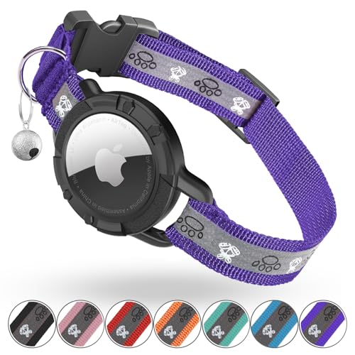 Reflective AirTag Cat Collar, Integrated Cat Tracker Collar with Air Tag Holder and Bell, Safety Elastic Band Cat GPS Collars for Girl Boy Cats, Kittens and Puppies (Purple, XS)