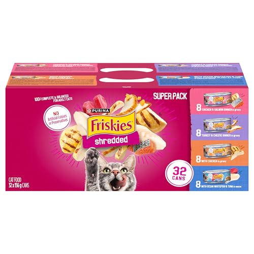 Shreds of turkey, chicken, and salmon, slow-cooked to perfection in gravy. Contains 8 x Friskies Shredded Turkey & Cheese Dinner in Gravy, 8 x Friskies Shredded with Chicken in Gravy, 8 x Friskies Shredded with Chicken & Salmon Dinner, and 8 x Friskies Shredded with Ocean Whitefish.