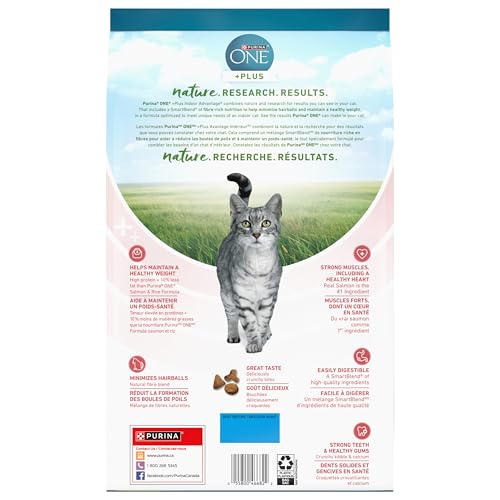 Nature. Research. Results. No matter how far science advances us, we always look to nature to inspire us. Purina ONE +Plus Indoor Advantage combines nature and research for results you can see in your cat. That includes a SmartBlend® of high-protein nutrition to help maintain a healthy weight, in a fibre-rich formula optimized to meet the unique needs of indoor cats. See the results Purina ONE can make in your cat. Purina ONE Cat +Plus Tailored Formulas build on an already solid foundation, creating tailored pet food options that support specific needs like healthy weight, healthy aging, hairballs and more. From energy and immune health to strong muscles, including a healthy heart, these high-quality formulas combine nature and research for results you can see in your cat. Try dry food options from veterinarian recommended Purina ONE today.