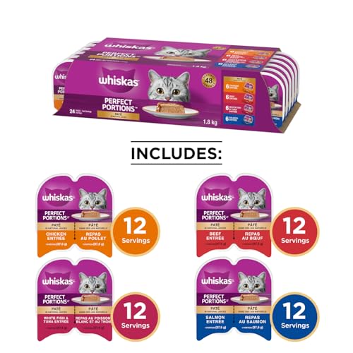FOR ADULT CATS AND KITTENS: 75g trays of WHISKAS PERFECT PORTIONS wet cat food paté, Chicken, Beef, Whitefish & Tuna, and Salmon Entrées