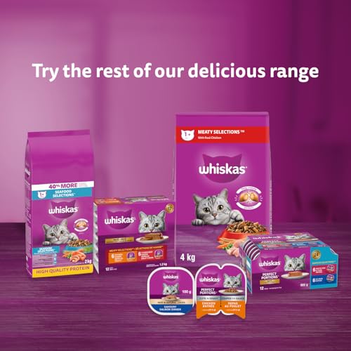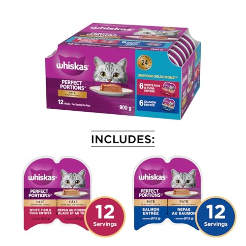 FOR ADULT CATS AND KITTENS: 75g trays of WHISKAS PERFECT PORTIONS Paté Whitefish & Tuna and Salmon Entrées