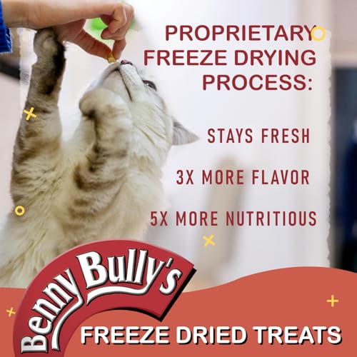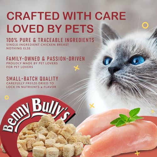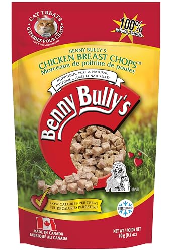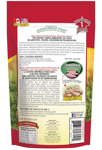 Real Food, Real Nutrition, Real Cat Treats™THE ORIGINAL SINGLE INGREDIENT CAT TREATNO ADDITIVES, FILLERS, COLOURING OR PRESERVATIVESCat owners have discovered Benny Bullys® as a nutritious pure and natural alternative to traditional cat treats. We developed an innovative cutting and drying process, as an alternative to conventional food preservatives, making Benny Bullys® one of the few “no chemicals added” treats on the market today. Made from pure chicken breast, we specially sized each piece small enough to provide easy feeding and maximum palatability to the most hard to please cats. Benny Bullys® is hand selected from government inspected meat sections for the health conscious cat owner.
