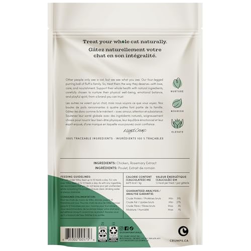 Crumps’ Naturals Freeze-Dried Chicken Cat Treats are made with 100% North American chicken, providing a high-quality, protein-packed snack your cat will love. These treats are freeze-dried to lock in natural flavors and nutrients, with a crunchy texture that cats enjoy. Free from artificial additives, they offer a healthy, low-calorie option to support your cat’s well-being, all while satisfying their taste buds.