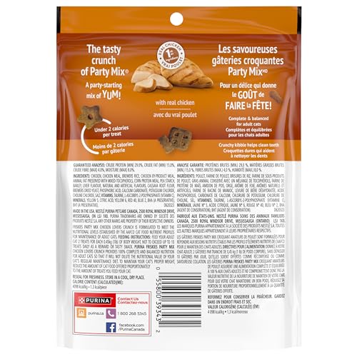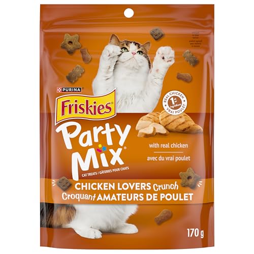 Entice your cat with the purr-fectly pleasing flavour of Purina Friskies Party Mix Chicken Lovers Crunch adult cat treats. Real chicken is the #1 ingredient in this mouthwatering recipe, so you can feel good about indulging her taste buds between meals. The crunchy texture keeps her happily nibbling away while also helping to clean her teeth, and the fun shapes capture her attention every time you offer up a cat treat. Reward her for being your best friend by giving her a treat when you come home at the end of the day, or incorporate a few pieces into playtime with your cat companion. She gets the taste and texture she adores, and you get the added peace of mind that comes from feeding her a snack for cats that is backed by a trusted brand. Formulated for adult cats, these Purina Friskies Party Mix cat treats provide a delectable way to show your cat she’s the center of your world. Satisfy your cat’s cravings for chicken with the delicious flavour found in Purina Friskies cat treats.