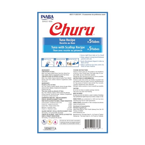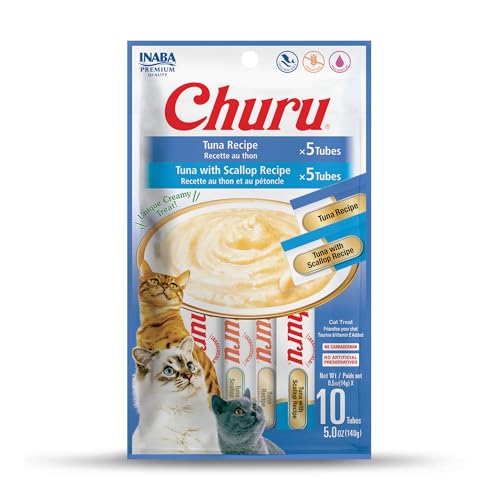 INABA Churu Cat Treats, Grain-Free, Lickable, Squeezable Creamy Purée Cat Treat/Topper with Vitamin E & Taurine, 0.5 Ounces Each Tube, 10 Tubes Total/Two Flavors, Tuna Variety