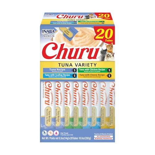 INABA Churu Cat Treats, Grain-Free, Lickable, Squeezable Creamy Purée Cat Treat/Topper with Vitamin E & Taurine, 0.5 Ounces Each Tube, 20 Tubes, Tuna Variety Box