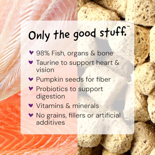 98% Fish, Organs & Bone: Our Sea-Licious Salmon & Cod recipe includes responsibly sourced fish ingredients such as wild-caught salmon and cod with ground bone, as well as cod liver oil
