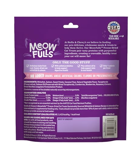 Stella & Chewy’s Meowfulls Freeze Dried Cat Treats Whitefish & Salmon Recipe pairs tasty proteins with purposeful ingredients, creating a craveable, healthy treat your cat will meow for! With added probiotics to help support digestive health, salmon oil to help support skin and coat health, and only one calorie per treat, Meowfulls are the perfect way to pamper your cat without compromising their diet.