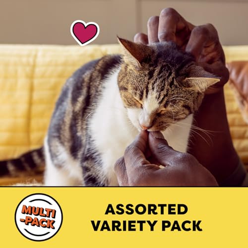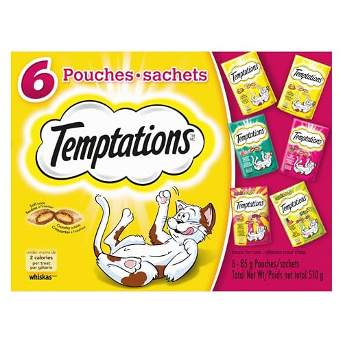 Contains: One (1) 6-count case of 85g pouches of TEMPTATIONS Cat Treats, Assorted Variety Pack: (2) Tasty Chicken Flavour (1) Beef Flavour (1) Seafood Medley Flavour (1) MixUps Chicken, Beef & Turkey Flavour (1) MixUps Chicken, Catnip & Cheddar Flavour