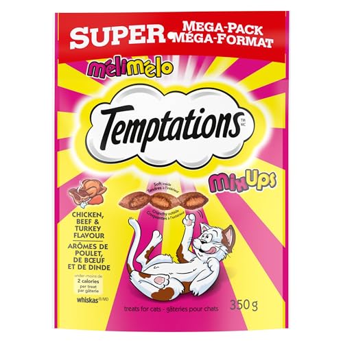 CONTAINS: One (1) 350g pouch of TEMPTATIONS MixUps Chicken, Beef, and Turkey Flavour, Super Mega-Pack