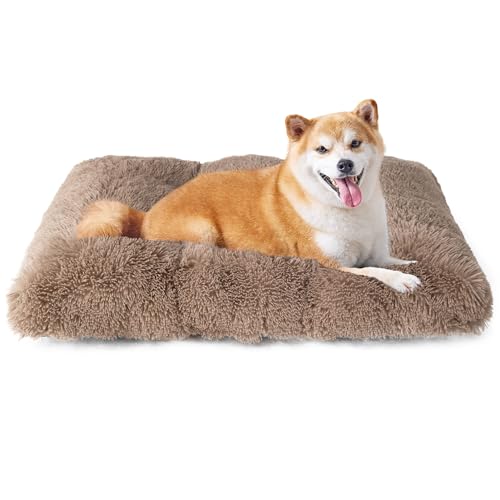 EHEYCIGA Calming Dog Crate Bed Large, Washable Anti Anxiety Dog Pet Bed, Fluffy Dog Pillow Mat with Anti-Slip Bottom, Camel, 35″x23.5″x3.5″
