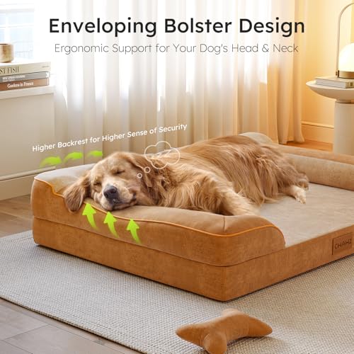 Extra Large Dog Bed, Orthopedic Dog Beds with Cooling Gel Memory Foam, Waterproof XL Pet Bed with Removable Washable Cover, 42″ Pet Sofa Couch Dutch Velvet with Bone Toy, Brown