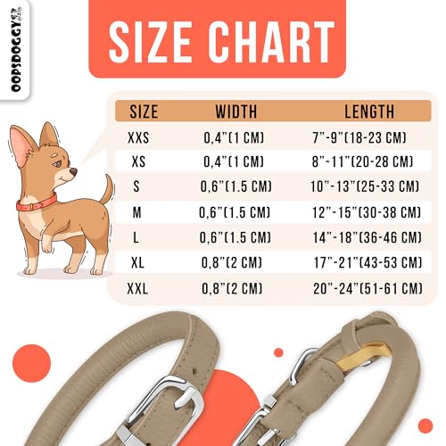 Size XXS: The rolled leather dog collar is thoughtfully designed to fit dogs with neck circumferences between 7″ and 9″. For the best fit, we recommend using a soft measuring tape to accurately measure your dog’s neck before purchase.