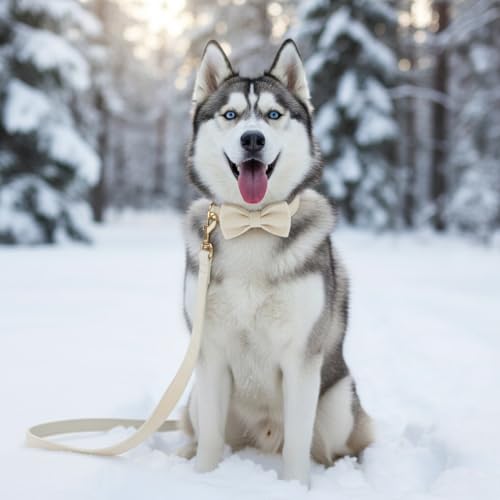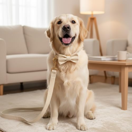 PETDURO Custom Dog Collar Personalized with Name Engraved Gold Metal Buckle for Large Medium Small Boy and Girl Dogs – Dog Leash and Bow Tie Set Available – Soft Comfy Velvet (Cream G, XS)
