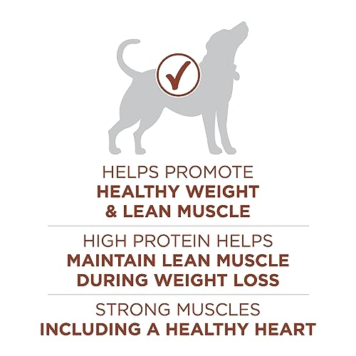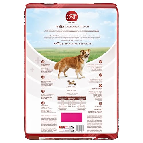Help your dog maintain a healthy weight with Purina ONE® SmartBlend® Healthy Weight Formula. High protein in every serving helps maintain lean muscle during weight loss, and natural sources of glucosamine aid joint health. With fibre and high-quality protein, this formula promotes fullness and an ideal body condition, so your dog gets the nutrition he needs. This weight management dog food contains 25% less fat and 15% fewer calories than Purina ONE SmartBlend Lamb & Rice Formula while still delivering a SmartBlend of ingredients for complete and balanced nutrition. Tender, meaty morsels plus crunchy kibble combine to give him the taste and textures he loves, and 0% fillers means that every high-quality ingredient has a purpose.